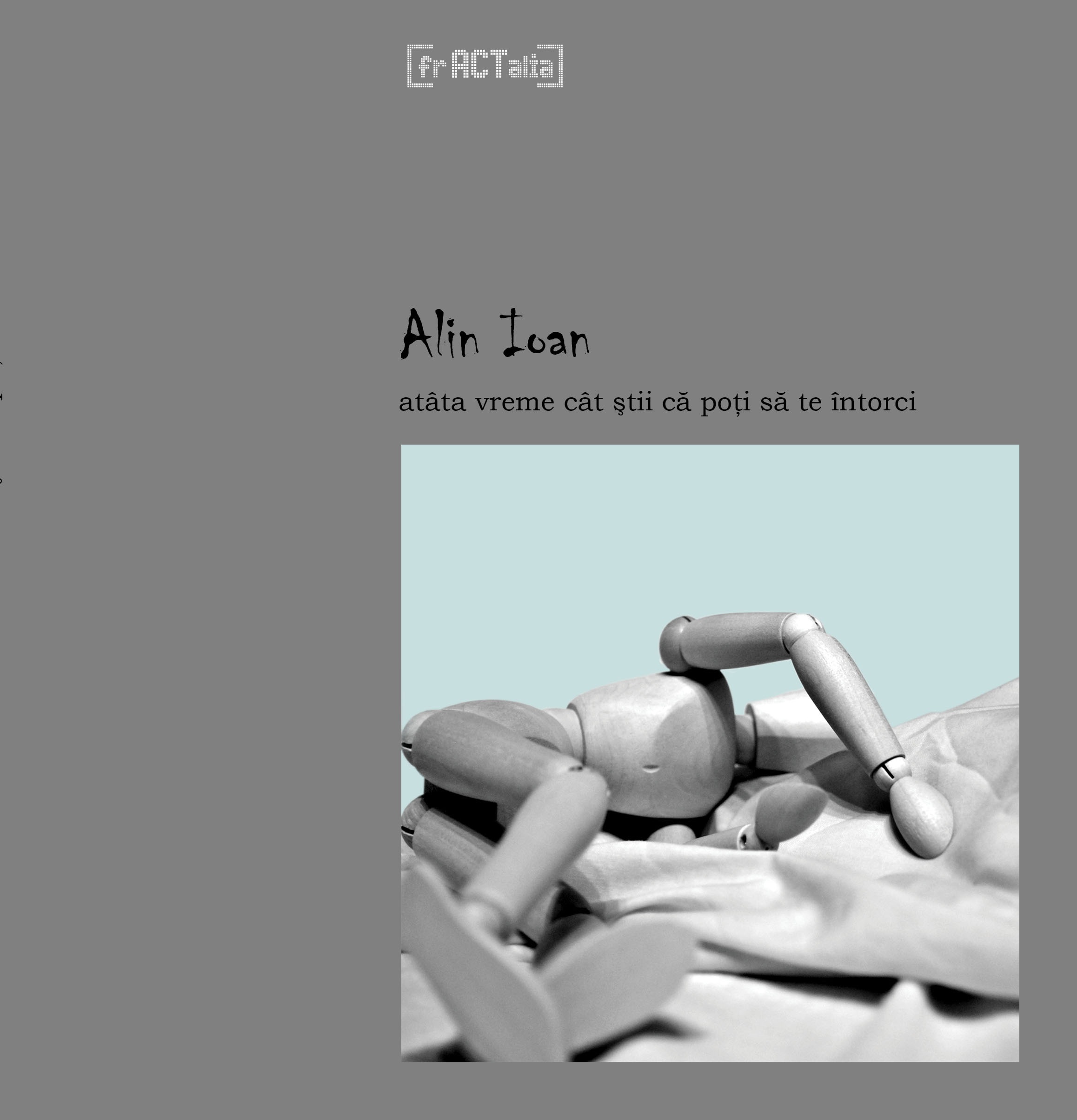 ALIN IOAN (n.1981) este absolvent de Teologie-Asistență Socială și locuiește în Arad. A debutat în 2016 cu volumul cer de rigips, nori de glet, publicat la Editura Fractalia. Este prezent în Antologia Subcapitol, poezia (Editura Tracus Arte, 2015). A mai publicat poezie în revistele: Lolita, Arca, Poesis International, Semne bune, Astra. Mai degrabă ar vrea să apară scris despre el că îi place să meargă cu bicicleta, consumă multă cafea și muzică. Are un aparat foto for fun etc.