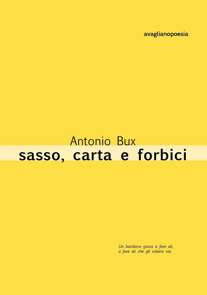 ANTONIO BUX (Foggia, 1982) a publicat mai multe cărți printre care Trilogia zero-ului (finalist al premiului Montano, câștigător al premiului Minturnae), Kevlar (câștigător al premiului Alinari), Sativi (ajuns în selecția premiului Città di Como), Naturario (finalist al premiului Viareggio) . Cea mai recentă publicație, apărută la editura Avagliano, în seria istorică fondată de Claudio Damiani și Andrea Di Consoli, este Piatră, hârtie și foarfece, cu o introducere semnată de Enrico Testa. Este traducător din limba spaniolă a diferiți autori, mai ales Leopoldo María Panero. De asemenea, are câteva publicații în limba spaniolă (23 – fragmentos de alguien, El hombre comido, Saga familiar de lobo estepario). A publicat o colecție de poezii în dialect foggian (Lattèssanghe, volum selecționat pentru premiul Città di Ischitella – Pietro Giannone). Poeziile sale au fost traduse în mai multe limbi și au apărut în antologii colective, cum ar fi InVerse: italian poets in translation editată de Universitatea John Cabot. În 2014, un juriu format din Marco Marchi, Dante Maffia, Giacomo Trinci și Giuseppina Amodei i-au acordat premiul Iris din Florența. A fondat și se ocupă de blogul Disgrafie, precum și de câteva colecții ce apar la editurile Marco Saya Edizioni și RPlibri.