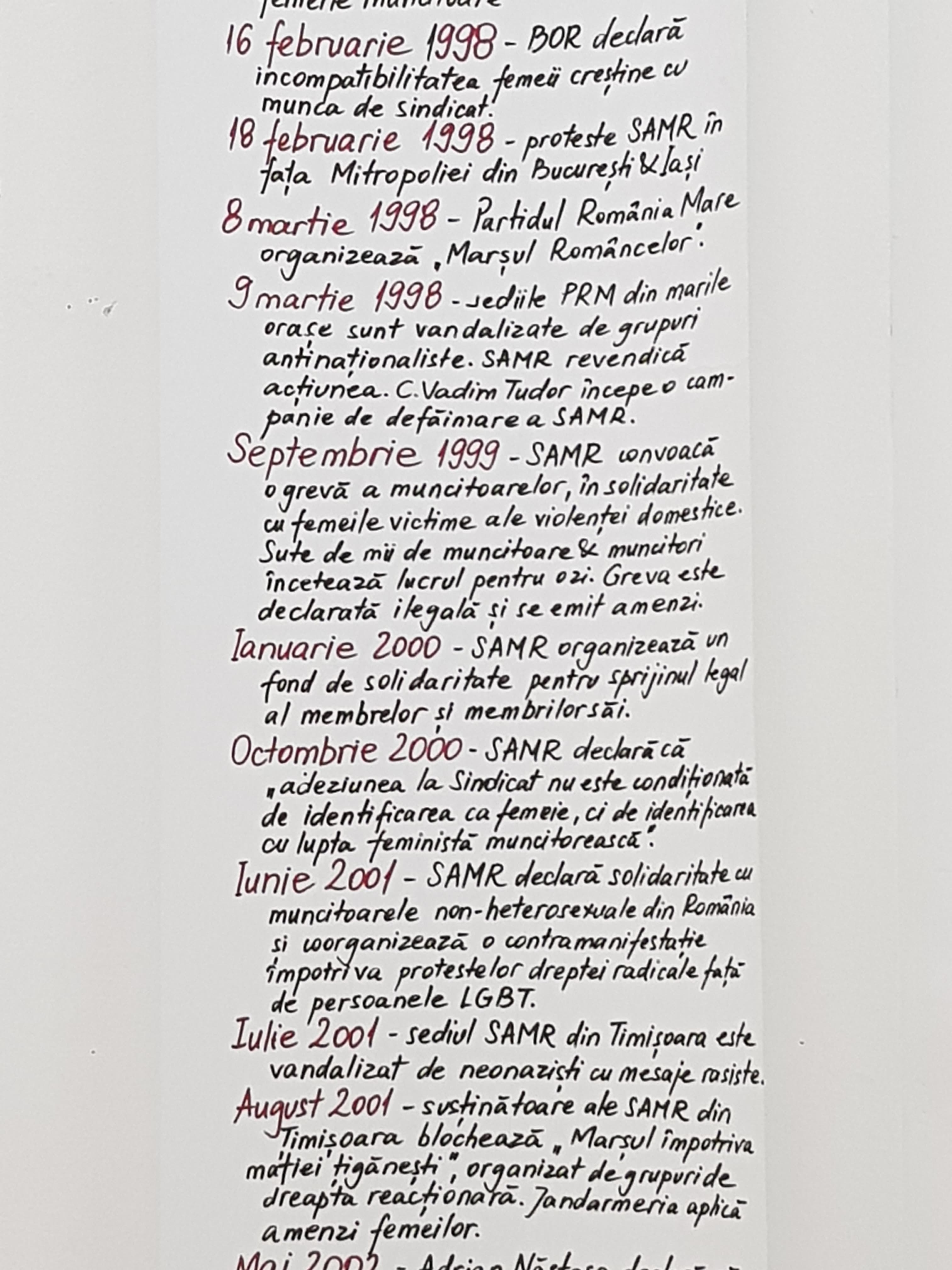 Începutul e cunoscut: fabrica Suveica este lăsată, la fel ca toate combinatele și uzinele, să se afunde în datorii și apoi se propune disponibilizarea pe un euro sau pe un dolar. Fabrici cu zeci de mii de angajați date pe nimic. O batjocură care încă nu este conștientizată la adevăratul ei potențial distructiv. Dar, ce să vezi, se făcea că așa, deodată, pe data de 8 martie 1991 au loc primele proteste la o fabrică de confecții, Napotex. Și muncitoarele se asociază și protestează și pe data de 9 martie 1991 scriu un Manifest care cuprinde revendicările lor. Deja în mai 1991 planurile de privatizare ale fabricii sunt anulate! Se înființează Sindicatul Autonom Napotex căruia i se alătură muncitorii de la Unirea și Maratex. În 1992 ia ființă Sindicatul Autonom al Muncitoarelor din România. În același an are loc o grevă generală și se revendică implicarea activă a muncitorilor în procesul de privatizare. În 1993 sindicatul respinge naționalismul și se declară internaționalist și multietnic. În 1996 se organizează proteste împotriva violenței îndreptate împotriva muncitoarelor și studenții se alătură acestor mișcări contestatare. SAMR luptă împotriva BOR care declară incompatibilitatea dintre femeia creștină și munca de sindicat. Sindicalistele de la SAMR luptă cu Vadim Tudor și cu politicile sale. În anul 1999 sindicatul organizează o grevă căreia i se alătură muncitori din toată țara în semn de solidaritate cu femeile victime ale violenței domestice. În 2001 muncitoarele se solidarizează cu persoanele non-heterosexuale și organizează un marș de contracarare a mișcărilor Noii Drepte împotriva comunității LGBTQ. Tot în acest an sediul din Timișoara al SAMR este vandalizat de reprezentanții noii drepte. Muncitoarele de la SAMR se opun marșului împotriva mafiei țigănești organizat de noua dreaptă organizat la Timișoara. Jandarmeria aplică amenzi femeilor. Încă din anul 2000 se organizase însă un fond comun de susținere al muncitorilor. În 2002 SAMR publică un manifest împotriva stângii politice din România. În 2003 SAMR sprijină protestele împotriva intervenției NATO în Iugoslavia. În 2005 marșul Noii Drepte e blocat de un protest al muncitorilor de la SAMR. Convinsă de prezența masivă în stradă a muncitorilor, primăria e convinsă de argumentele prezentate cu acest prilej pentru a nu mai autoriza alte marșuri ale Noii Drepte. În 2007 are loc o grevă generală inițiată de SAMR. Se alătură alte organizații feministe, membrii comunității LGBT, sindicate studențești și alte grupuri antiautoritariste. În 2010 primăria evacuează familiile de pe strada Coastei. SAMR sprijină actiunile împotriva evacuărilor forțate si pentru justiție locativă ale grupurilor activiste locale.