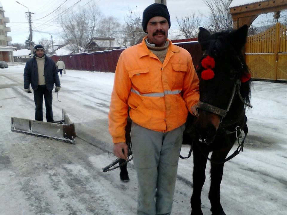 Obiceiuri străvechi din Covasna – plug de lemn tras de cal pentru deszăpezire.