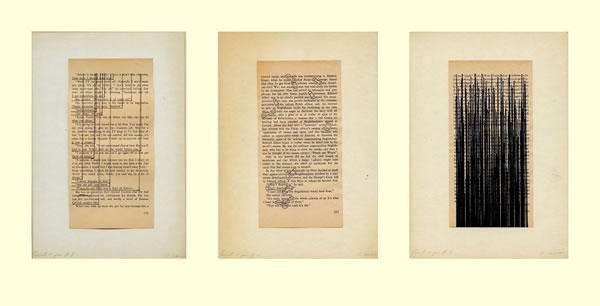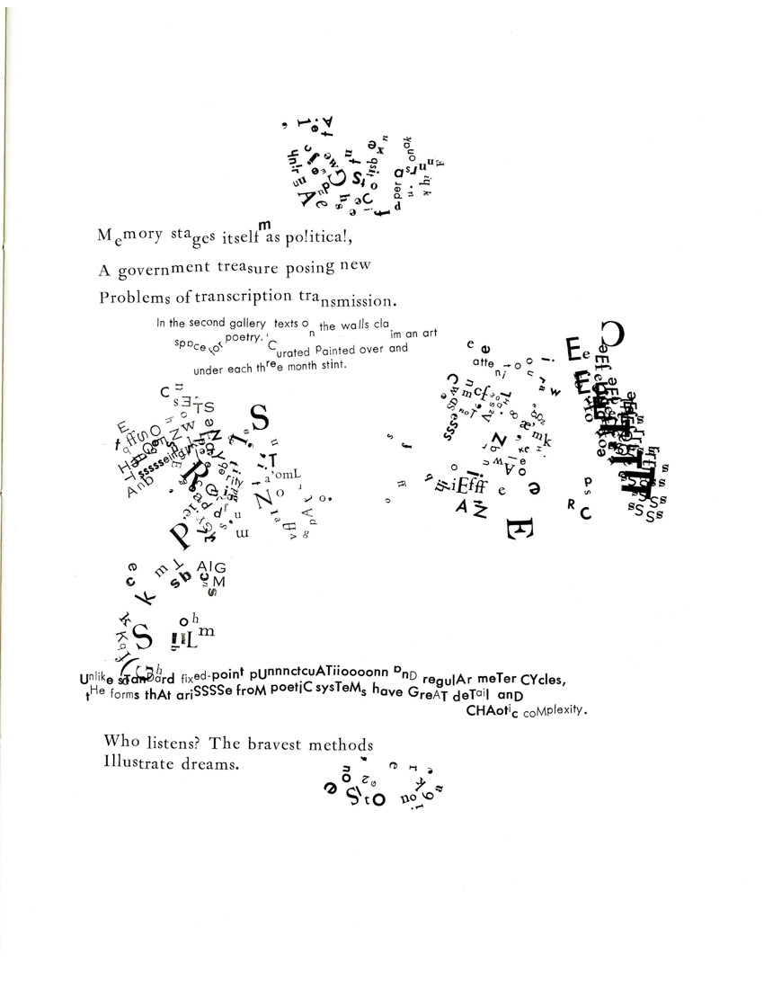 (Pagină din Stochastic Poetics (2013), o carte de Johanna Drucker ale cărei 39 de exemplare diferă unele de altele, cu texte din Aristotel, din teoriile haosului și alte surse care au fost combinate și tipărite diferit de la un exemplar la altul.)