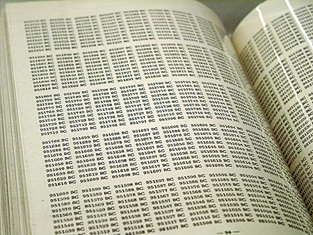 (Pagini din One Million Years (1999), o carte a artistului conceptual On Kawara.)