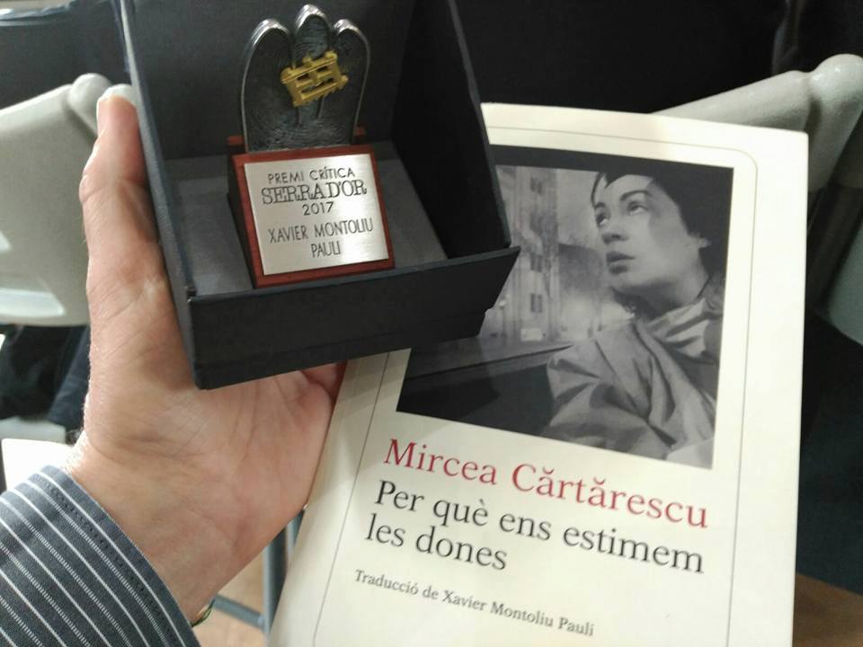 În prezent, literatura catalană și literatura romană, în acest aspect, se află într-un moment important. Din două motive: primul, pentru că s-au sărbătorit 70 de ani ai unei persoane foarte iubite în Catalonia datorită faptului că a făcut literatura catalană cunoscută în România, din epoca medievală pînă în prezent. Vorbesc, bineînțeles, despre Jana B. Matei. Am publicat în numărul din mai, al revistei Serra d’Or un extras din interviul apărut în volumul omagial dedicat aniversării ei (Viața printre vieți / La vida entre vides. Festschrift für Jana Balacciu Matei. București: Editura Omonia, 2017). Cel de-al doilea motiv de bucurie pentru literaturile noastre, cea românească și catalană, este decernarea premiului Criticii Serra d’Or lui Xavier Montoliu Pauli, pentru traducerea cărții lui Mircea Cărtărescu, Perquè ens estimem les dones [De ce iubim femeile], sărbătorit de critica catalană din momentul apariției sale. Ca membru al juriului, trebuie să spun că acest premiu este și o recunoaștere a traiectoriei lui Xavier Montoliu Pauli care într-o zi destul de îndepărtată a început demersurile, cînd a fost numit lector de catalană la Universitatea din București. De atunci, țese alianțe lingvistice și culturale, care departe de a fi fost stinse, au crescut și au făcut posibilă apariția unei producții literare de primă clasă, cea românească, necunoscută pentru majoritatea catalanilor până acum puțin timp. În acest sens, decernarea premiului, pe lângă înalta calitate literară a traducerii, este și mulțumirea unui om care a încercat și a reușit cu măiestrie să echilibreze balanțele traducerilor literare între Catalonia și România. O voce nouă, cea a lui Xavier Montoliu Pauli, care aparține deja listei traducătorilor premiați ai Criticii Serra d’Or și care, cum am mai spus înainte, a început deja, fără nicio îndoială, consolidarea ei.