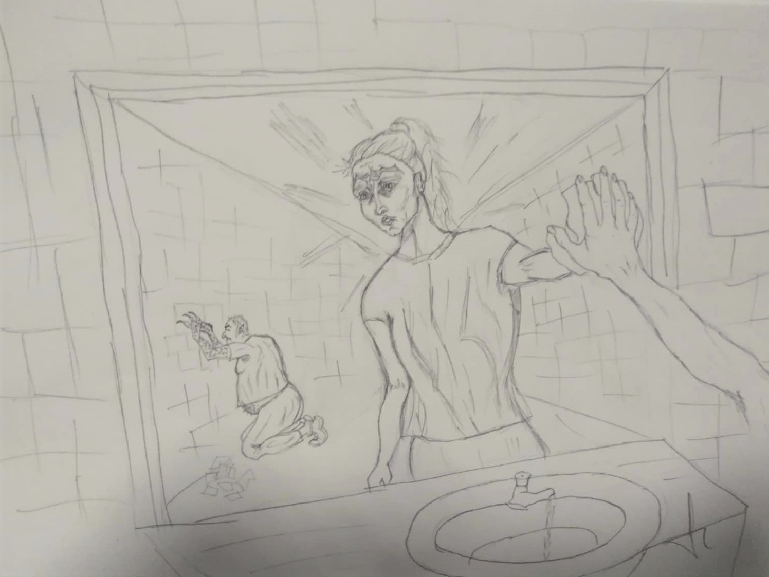 eu sunt în baie. în fața chiuvetei. privesc în oglindă. individul în genunchi plasează ultima bucată de gresie, se ridică greoi și iese.